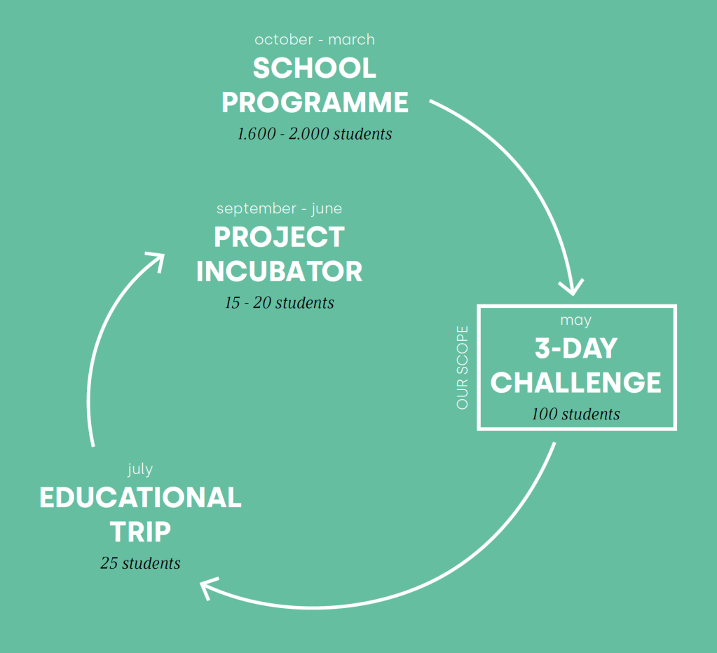 A 3-day challenge bringing together 100 students from 25 schools across Spain, and including different types of activities: inspirational talks by leading industry stakeholders, working time with the support of their assigned coaches, and leisure activities to connect with other students. Click the image to see the detail: