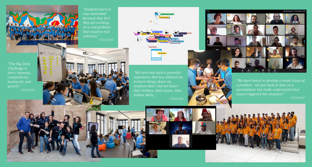 In this context, our brief was to build a learning challenge from scratch for the Big Data learning programme, which aimed to promote digital and analytical skills among students. The challenge would bring together students from all over the country in an intensive 3-day experience that promoted learning and fun, and that was so inspiring that made the community grow each year. The first pilot was in 2018, and since then, each year we hosted more students, integrated improvements, such as new learning tools and experiences, or adapted to unforeseen situations like Covid-19 and the need to bring the challenge online.