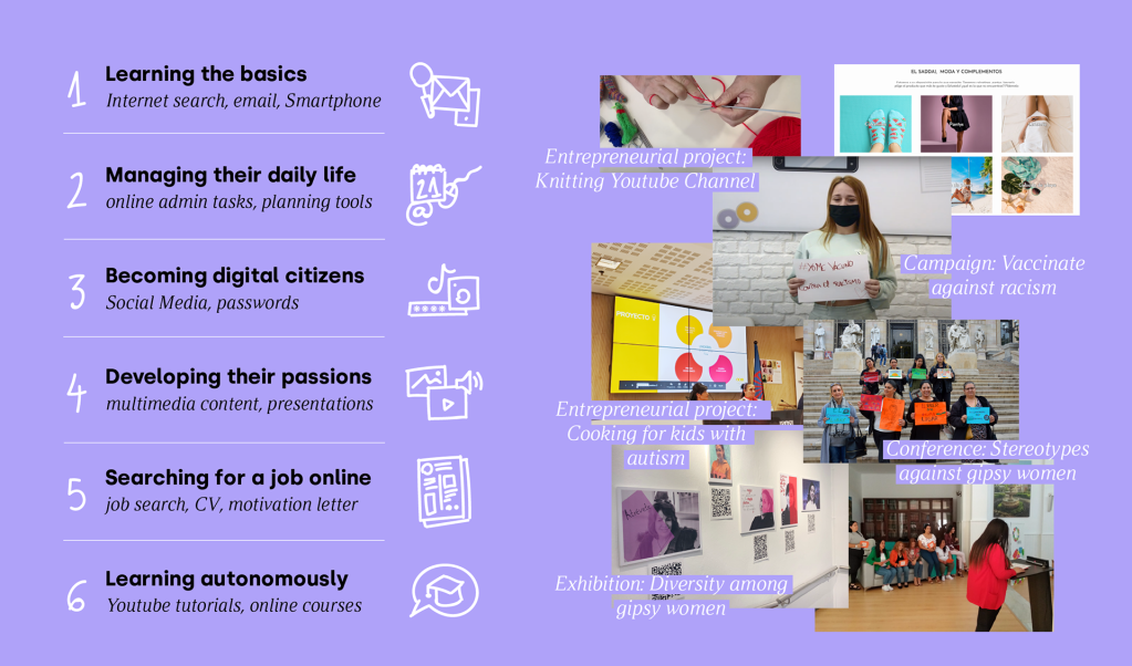 Fundación Orange wanted to promote digital education for women in order to close the digital gap. The plan was to provide different NGOs working with women with equipment, content, methodologies, and training for its professionals. Our mission was to create a course curriculum and methodology for marginalised women with low digital skills, but that was able to acknowledge and embrace their diversity – for instance, through a flexible methodology or project-based learning.